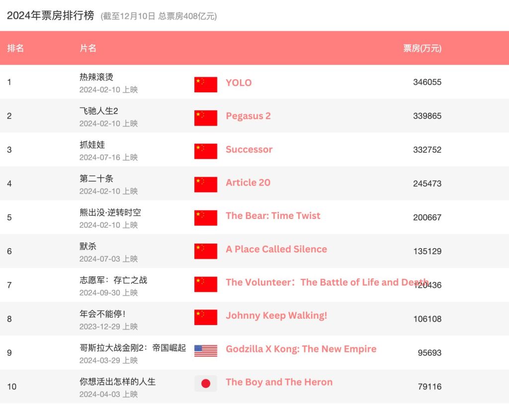 While 2023 was dominated by domestic films, with all top 10 spots taken by local productions, 2024 saw a more diverse range of films. Hollywood blockbusters like Godzilla X Kong: The New Empire and Kung Fu Panda 4 performed reasonably well, they were still unable to match the success of domestic films. Even the highly anticipated Dune: Part Two failed to crack the top 10. Surprisingly, the Studio Ghibli film The Boy and the Heron made a significant impact on the Chinese box office, securing a spot in the top 10.